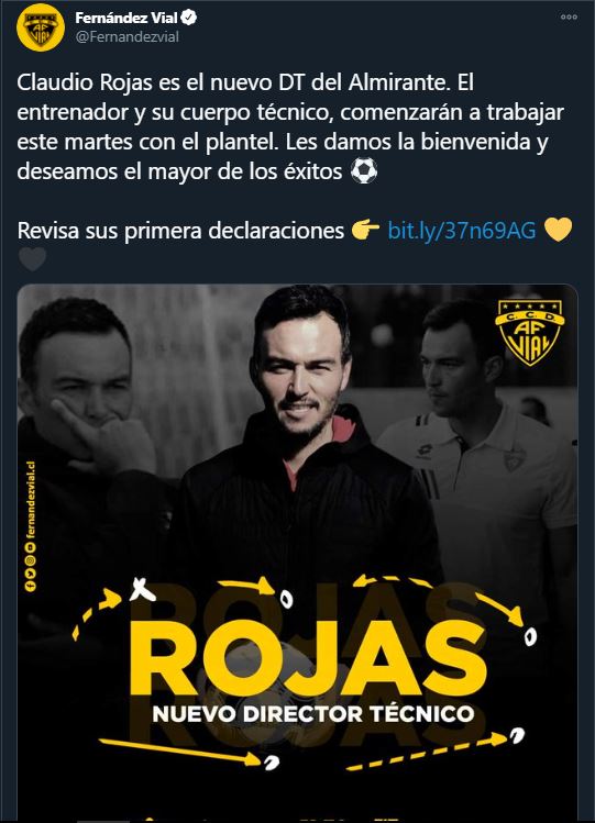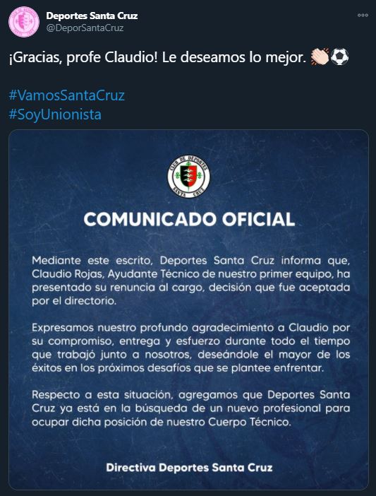 Claudio Rojas quien fuera el ayudante técnico en Deportes Santa Cruz, se supo esta tarde por redes sociales que deja Santa Cruz para cambiarse a Concepción, recalando en Fernandez Vial de esa ciudad.