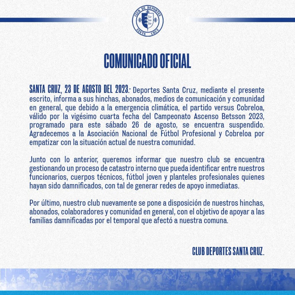 Este medio día, Deportes Santa Cruz emitió un comunicado en donde daba a conocer la suspensión del encuentro entre mineros y unionistas en el Zorros del Desierto por la fecha vigésimo cuarta del ascenso 2023.