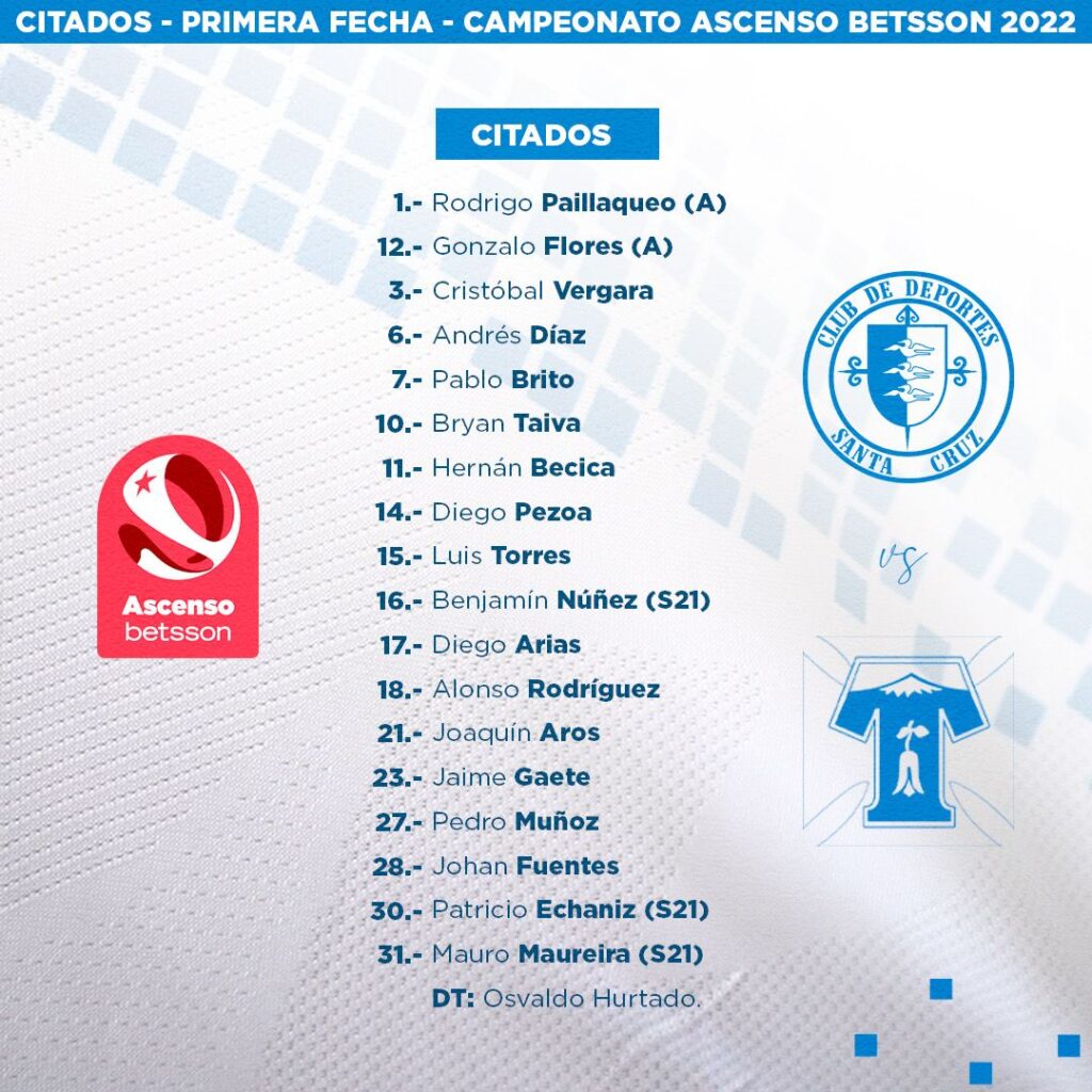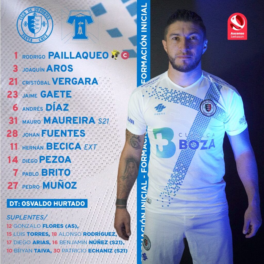 Deportes Santa Cruz (1): Rodrigo Paillaqueo; Joaquín Aros, Cristóbal Vergara, Jaime Gaete (30’ Alonso Rodríguez), Andrés Díaz (73’ Bryan Taiva), Mauro Maureira (66’ Diego Arias), Johan Fuentes, Hernán Albano Becica, Diego Pezoa, Pablo Brito, Pedro Muñoz. DT. Osvaldo Hurtado.