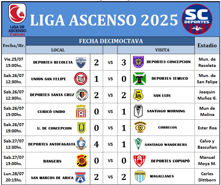 La fecha comenzó el viernes con el triunfo visitante del León de Collao sobre los textiles por 2 a 0. Goles: 1-0 15´Nicolas Carvajal (R). 1-1 27′ Joaquín Larrivey (DC). 1-2 51′ Joaquín Larrivey (DC). 1-3 70′ Josué Ovalle (DC). 2-3 84´David Salazar.