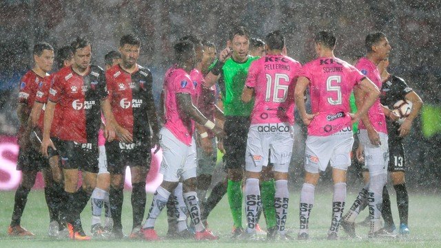 Luego de estar mas de 30 minutos suspendido el encuentro por la acumulacion de agua en el terreno de juego de Cerro Porteño, a causa de un fuerte temporal que sacudió a la ciudad de asuncion.
