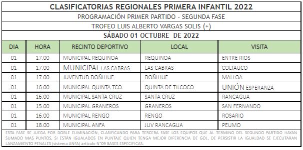 El primer turno, a partir de las 16:00h, será para la selección Primera Infantil que recibe a su similar de Rancagua, los dirigidos por Carlos Diaz, si quieren seguir en carrera, debe remontar un resultado de 2 a 0 que sufrieron en la ida.