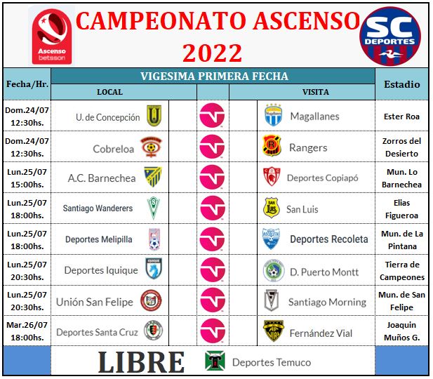 La fecha 21° del Ascenso Betsson 2022 comienza mañana y termina el martes con el encuentro entre Deportes Santa Cruz y Fernandez Vial a partir de las 18:00hs.