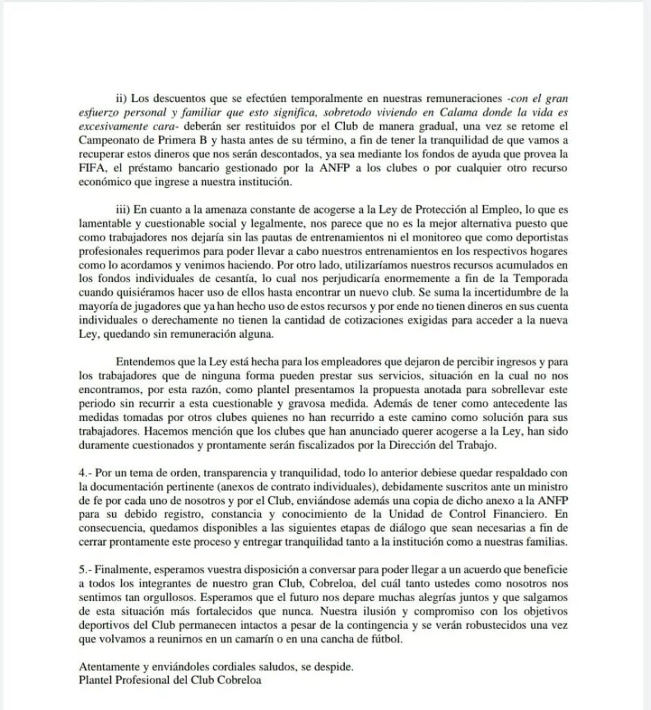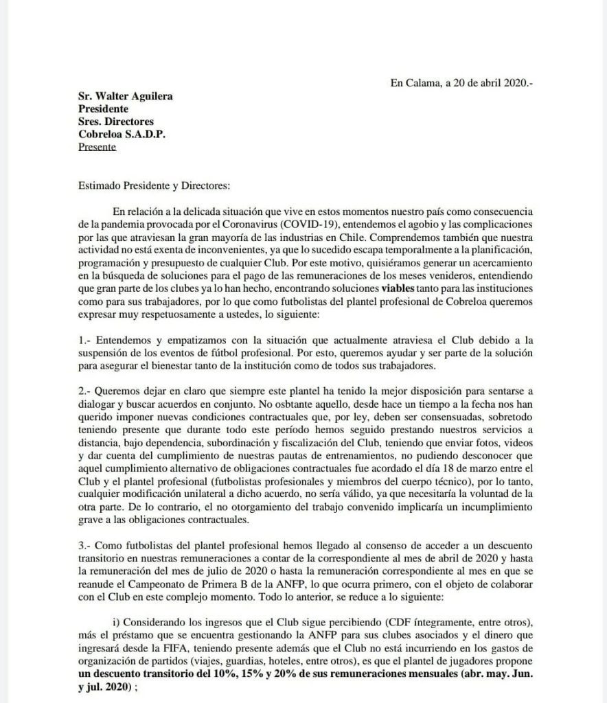 Rápidamente el plantel reacciono y envió una misiva al directorio Loino en donde proponen una rebaja de sueldo y al término de la temporada se les devuelva los montos que se retuvieron.