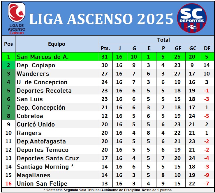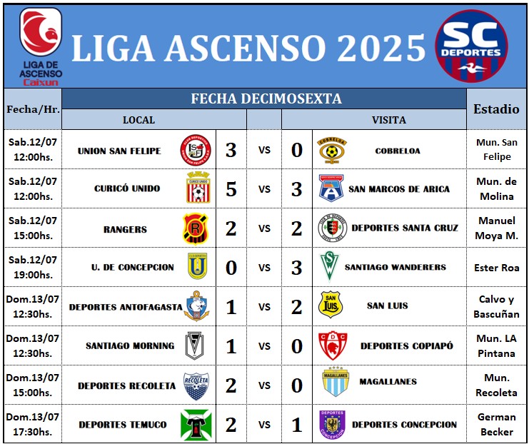 Terminó la fecha decimosexta fecha de la Liga de Ascenso 2025, en donde San Marcos se mantuvo como líder pese a su derrota, mientras que en la parte baja, San Felipe pese a golear volvió al último lugar.