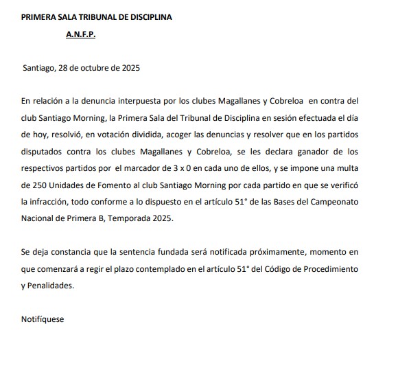 Tras las denuncias de los clubes implicados, el tribunal autónomo de la ANFP resolvió…. “en votación dividida, acoger las denuncias y resolver que en los partidos disputados contra los clubes Magallanes y Cobreloa, se les declara ganador de los respectivos partidos por el marcador de 3 x 0 en cada uno de ellos, y se impone una multa de 250 Unidades de Fomento al club Santiago Morning por cada partido en que se verificó la infracción, todo conforme a lo dispuesto en el artículo 51° de las Bases del Campeonato Nacional de Primera B, Temporada 2025″, se explicó en el fallo; pese a ello, los Bohemios podrán apelar el fallo y será la Segunda Sala quien tenga la última palabra. Recordemos que el club fue sancionado con la resta de nueve unidades por el no pago de cotizaciones previsionales, apeló al TAS y se espera el fallo del organismo internacional.