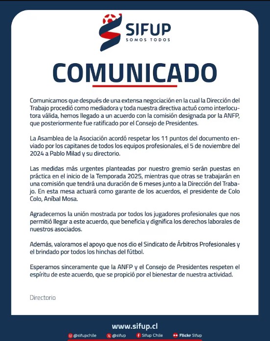Tras dos meses de negociaciones, el Sindicato de Futbolistas Profesionales (Sifup) dio por terminada la huelga que mantenía en vilo el inicio de Copa Chile y de los Torneos 2025 del futbol profesional.