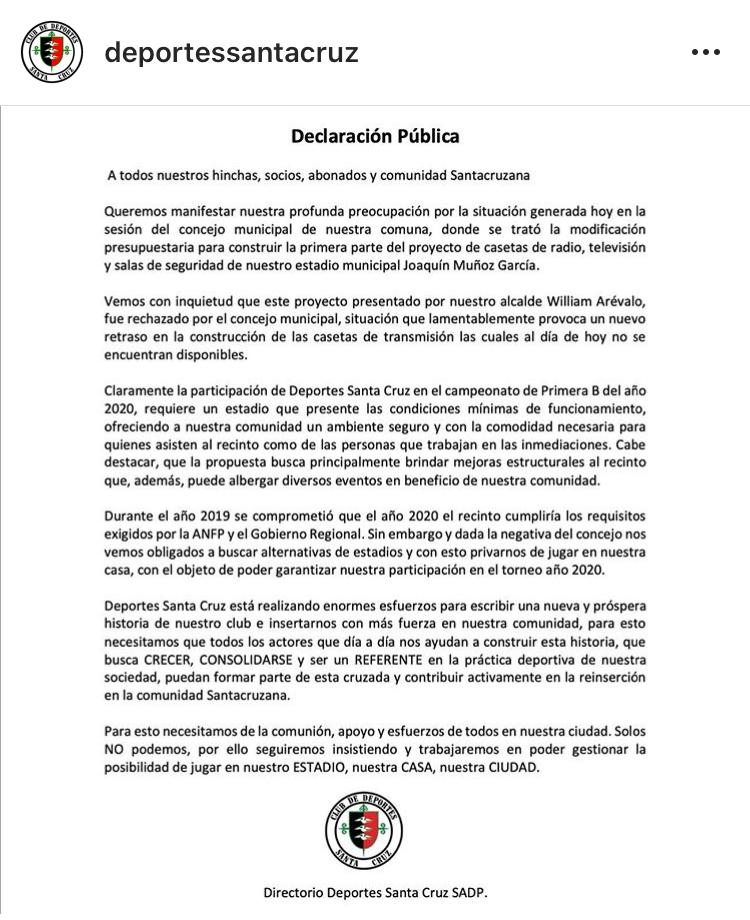 Pero eso no es todo, con esta negativa de las nuevas casetas, Deportes Santa Cruz peligra la localía, multas y perdidas millonarias en cuanto a ingresos y arriendos. Alguien le esta escondiendo el balón al club.